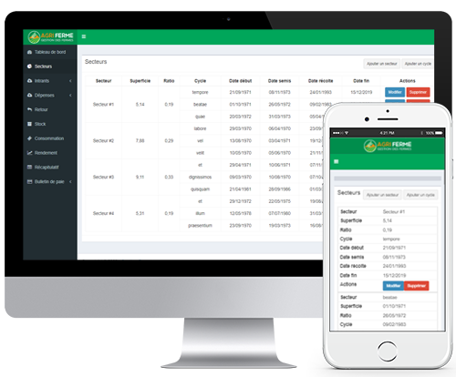 Tenue de vos stocks de produits (entrées, sorties, retours, dépenses), regroupés par secteurs et cycles.